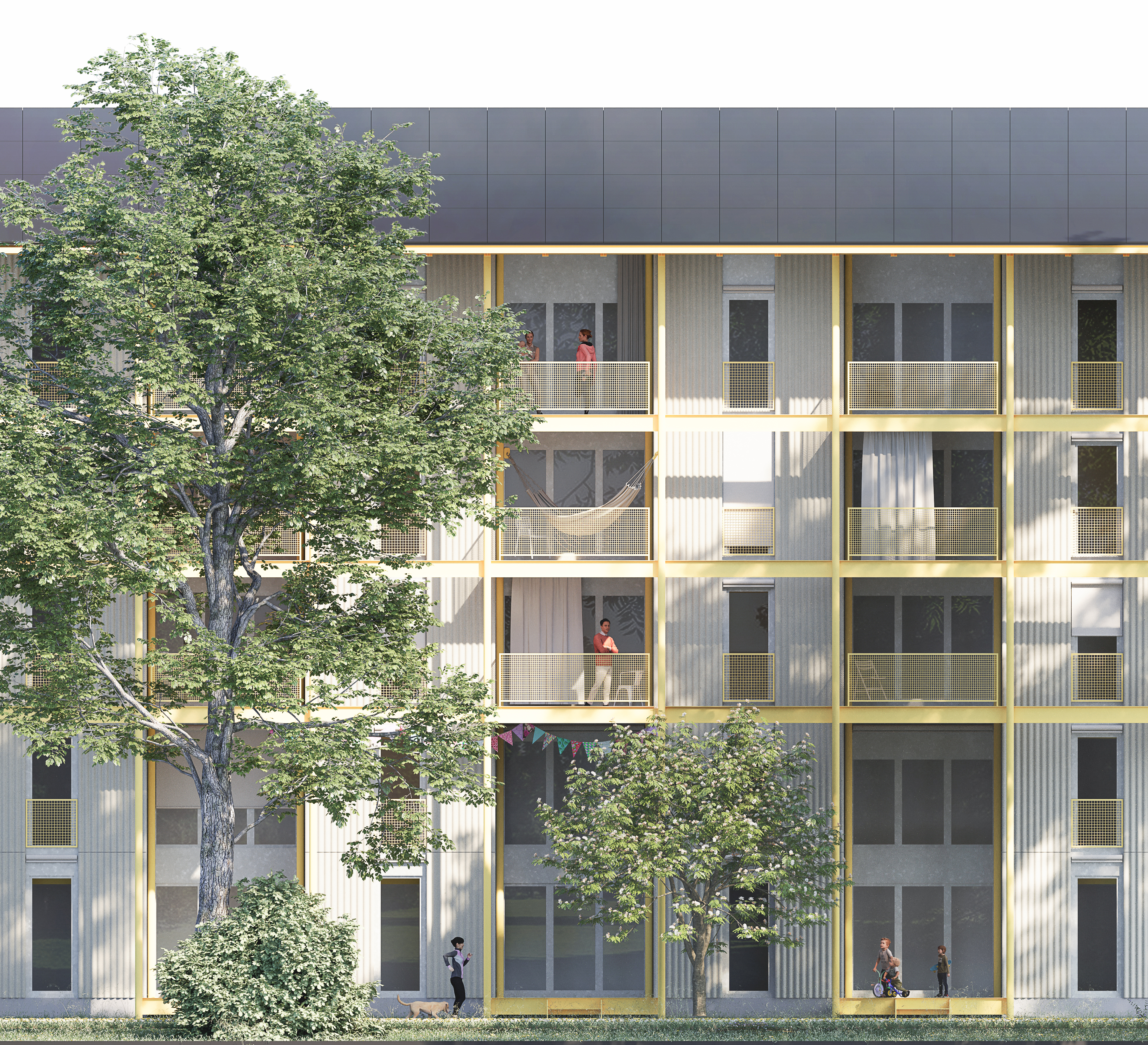 Die hybride Konstruktion verbindet Holzbauweise mit Stahlbeton. Die Hauptstruktur besteht aus Holzstützen und -trägern. Brettstapeldecken ohne Klebstoffe ermöglichen eine spätere Zerlegung. Die selbsttragende Balkon- und Erschliessungsschicht aus Stahl ist verschraubt und demontierbar. Die Fassade aus gewellten Faserzementplatten ist unterhaltsarm und wiederverwendbar. Das statische System basiert auf einem Stützenraster mit Unterzügen, während Aufzugsschächte und Wandscheiben die seismische Stabilität gewährleisten. Das konstruktive Konzept erzeugt Fassaden mit variierenden Tiefen, die einen Kontrast zur einfachen Volumetrie erzeugen. An den Stirnfassaden reagiert das Haus gestalterisch und räumlich auf die besondere Gegebenheit.”